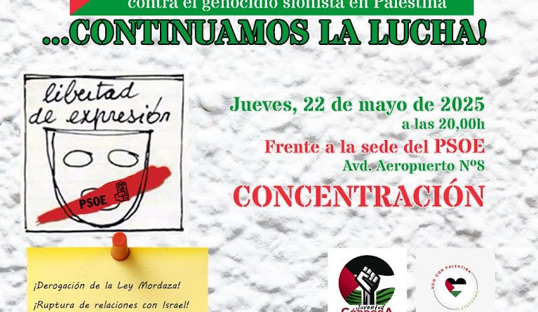 La Plataforma Córdoba con Palestina, la Asamblea por Palestina, la Red UCO con Palestina, Juventud de Córdoba por Palestina y la iniciativa Mejor sin Armas convocan una concentración el jueves día 22 de mayo en la avenida del Aeropuerto n.º 8, frente a la sede del PSOE, con comienzo a las 20,00 horas.