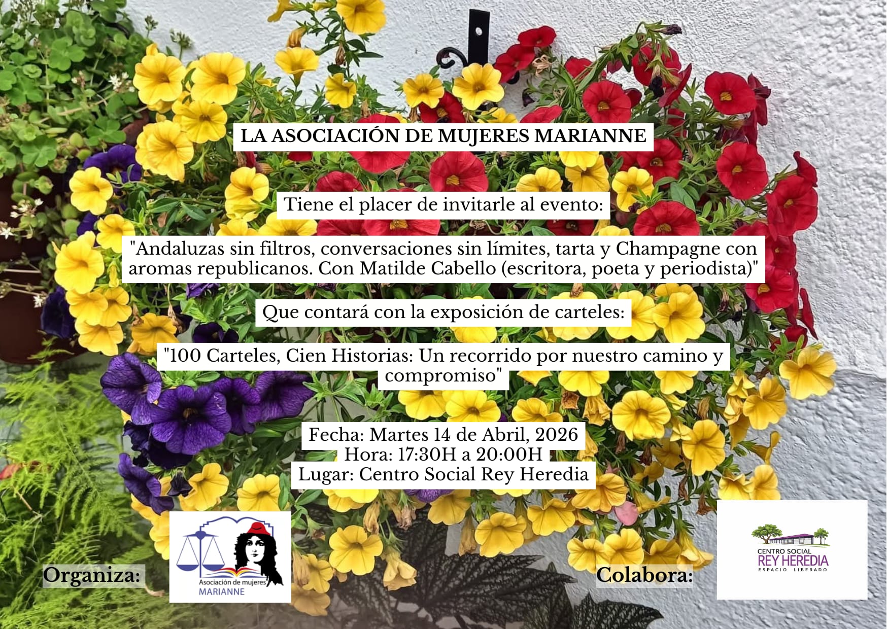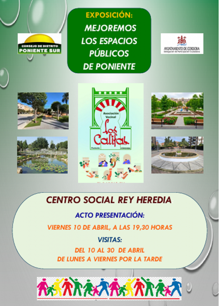 Exposición: Mejoremos los Espacios públicos de Poniente Detalles de Evento Este evento sucederá desde el 10 abril 2026 hasta el 30 abril 2026. Ocurrirá nuevamente el viernes, 10 abril 2026 19:30 Lugar de encuentro: Pasillo del C.S. Rey Heredia Categorías: Actividades/eventos Fechas Entrantes: viernes, 10 abril 2026 19:30lunes, 13 abril 2026 19:30martes, 14 abril 2026 19:30miércoles, 15 abril 2026 19:30jueves, 16 abril 2026 19:30viernes, 17 abril 2026 19:30lunes, 20 abril 2026 19:30martes, 21 abril 2026 19:30miércoles, 22 abril 2026 19:30jueves, 23 abril 2026 19:30viernes, 24 abril 2026 19:30lunes, 27 abril 2026 19:30martes, 28 abril 2026 19:30miércoles, 29 abril 2026 19:30jueves, 30 abril 2026 19:30 Acto de Presentación el viernes 10 de Abril, a las 19:00h. VISITAS Del 10 al 30 de Abril, de Lunes a Viernes por la tarde.