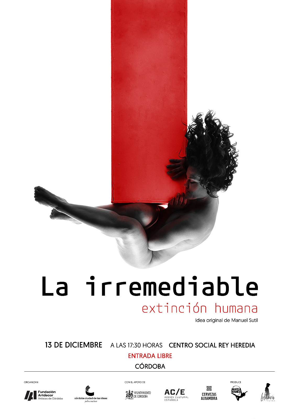 Actividades LA IRREMEDIABLE extinción humana, el 13 de diciembre a las 17:30h. lunes, 11 diciembre 2023 joomla Idea original de Manuel Sutil Lugar de encuentro: Centro Social Rey Heredia Obra de teatro con danza aérea Entrada libre