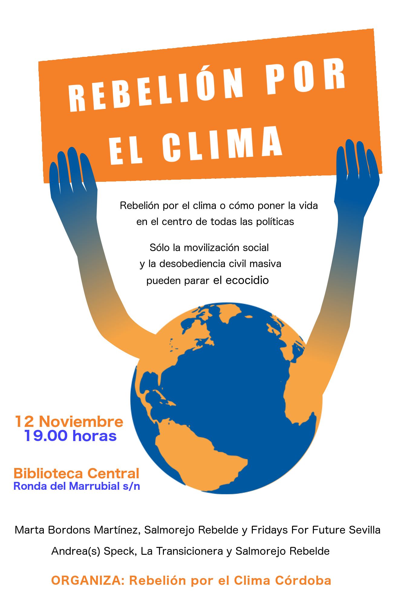 Esta actividad, que se celebrará a las siete de la tarde en el Salón de actos de la Biblioteca Central (Ronda del Marrubial s/n) tiene por título “Rebelión por el clima o cómo poner la vida en el centro de todas las políticas.Solo la movilización social y la desobediencia civil masiva pueden parar el ecocidio»y en ella participan: