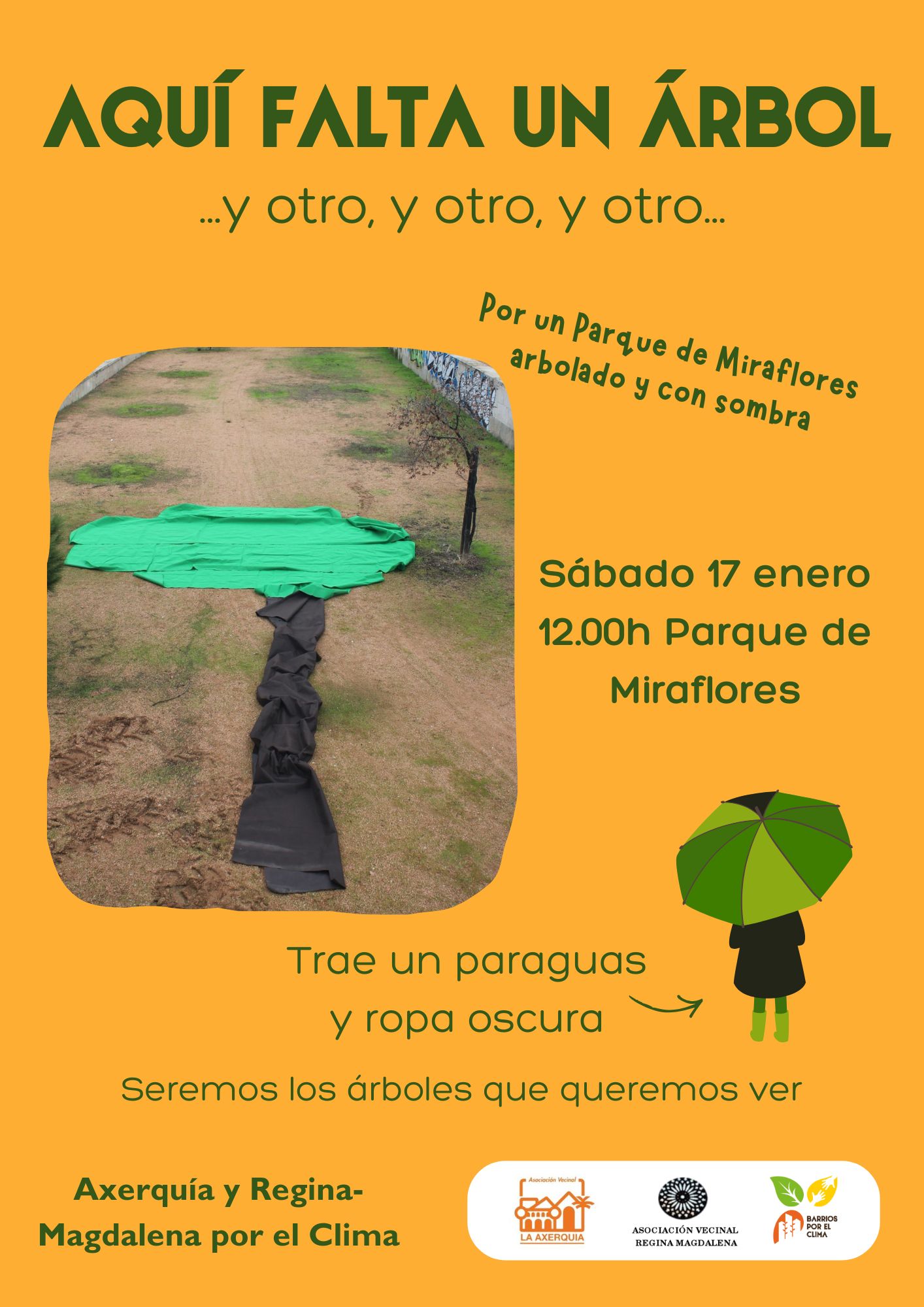 Ante la falta de respuesta del área de Infraestructuras, las iniciativas climáticas vamos a organizar el sábado día 17 de enero una acción reivindicativa para la que os pedimos colaboración: instalaremos un árbol de grandes dimensiones recortado en tela, instalaremos nuestros muy acreditados cartelones, desplegaremos pancartas y nos mimetizaremos como árboles llevando paraguas revestidos de tela verde a modo de copa y vestidas con ropa oscura a modo de tronco. Cuantas más personas participemos en esta representación, mejor, y para eso contamos con vuestra colaboración.