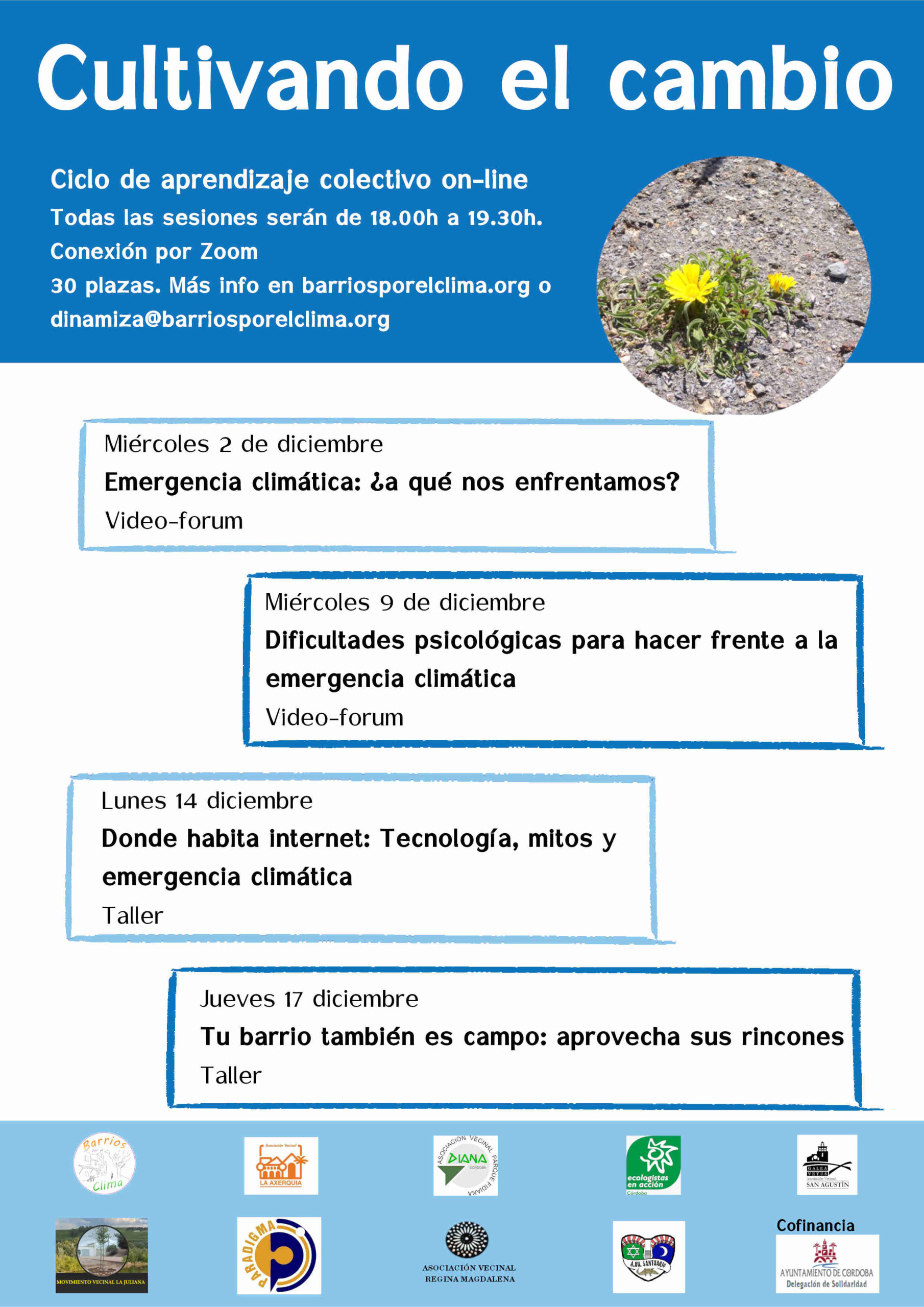Dentro del programa Barrios por el clima hemos puesto en marcha un ciclo on line de formación que se va a desarrollar los días 2, 9, 14 y 17 de diciembre. Tenéis toda la información del ciclo en la web de BxC: