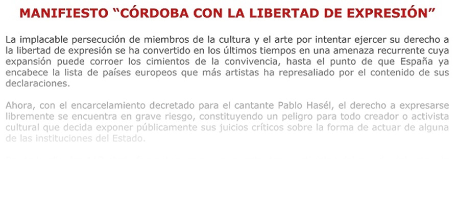 Por todo ello, los 294 abajo firmantes, como representantes y activistas del mundo del arte y la cultura de Córdoba, manifestamos nuestro apoyo a Pablo Hasél y exigimos su puesta en libertad, así como que se erradiquen del Código Penal este tipo de delitos que impiden no solo el democrático ejercicio de la libertad de expresión, sino también de nuestra libertad artística y de pensamiento.
