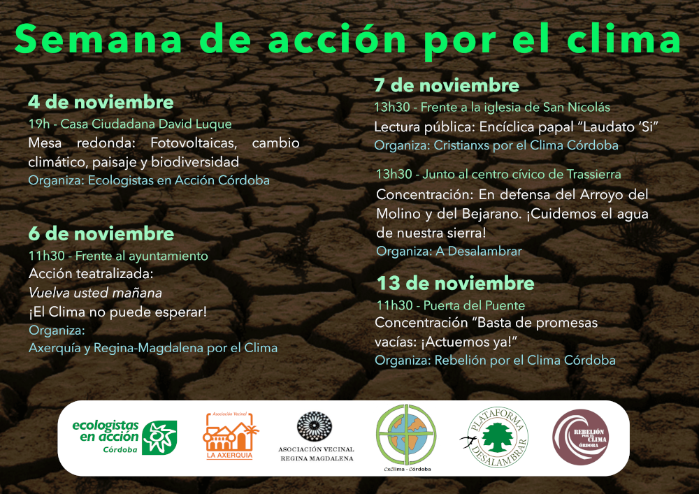 Diferentes colectivos cordobeses organizarán movilizaciones, mesas redondas y lecturas de documentos relacionados con la Emergencia climática en diferentes localizaciones de la ciudad coincidiendo con la celebración de la cumbre del clima en Glasgow.