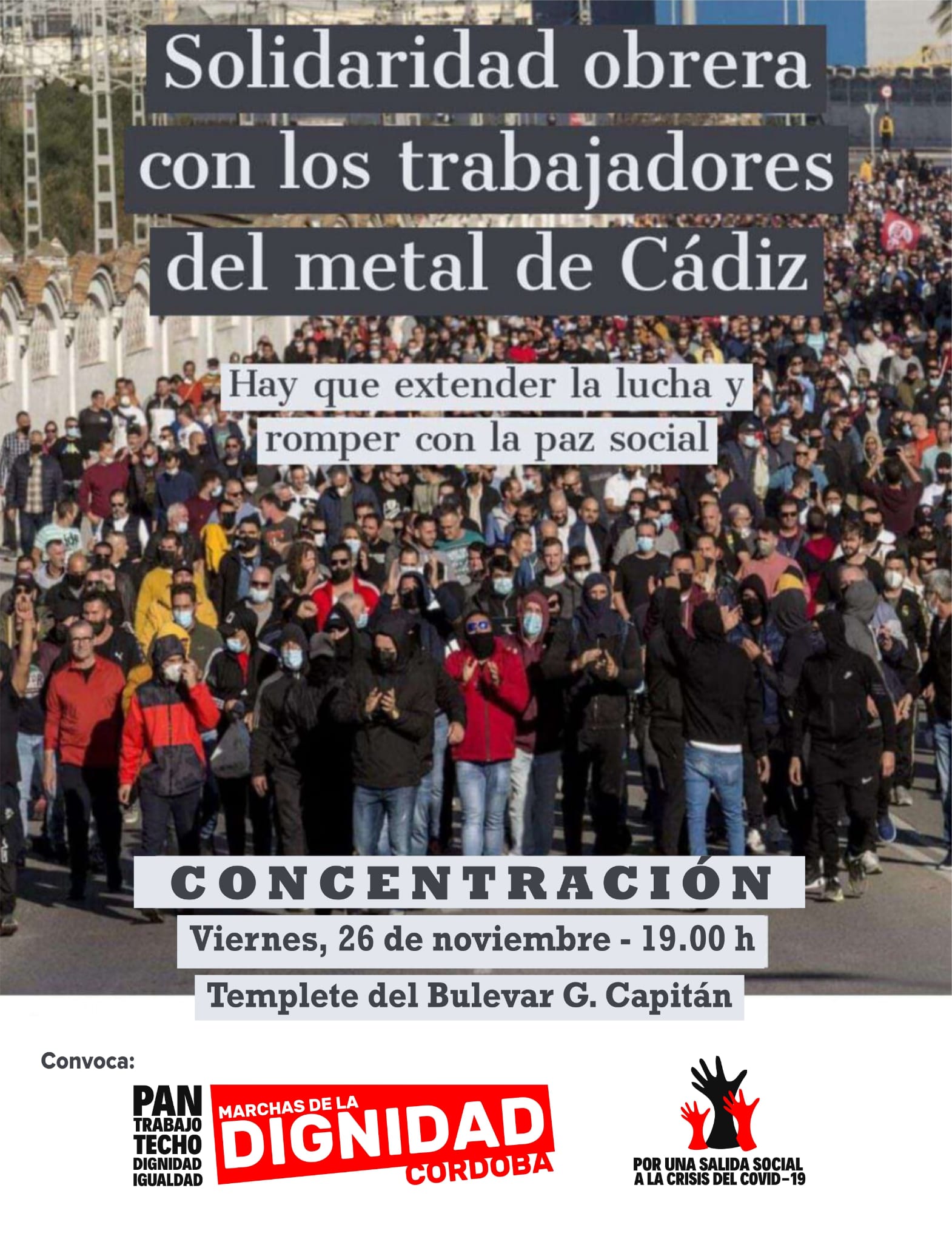 Concentración en Solidaridad obrera con los trabajadores del metal de Cádiz, el 26 de noviembre a las 19:00h.
